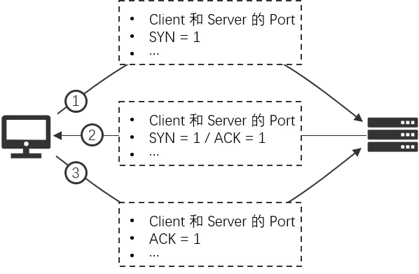 - 首先客户端创建 TCP 头部,头部包含目标服务器的端口号等,同时将头部的 SYN 设为 1,表示开始请求连接。TCP 头部创建好了之后,TCP 模块便将信息传递给 IP 模块并委托它发送,然后信息经过网络到达服务器的 IP 模块再到 TCP 模块,TCP 模块则会根据 TCP 头部的信息找到端口号对应的套接字,套接字则会写入相应的信息,然后将状态改为“正在连接”;