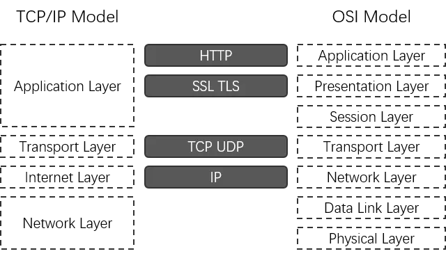 先介绍一下什么是 HTTPS。HTTPS 正如其名字,HTTP 代表其并不是自己创建一个新的协议,而是建立在 HTTP 的基础之上,S 代表其是安全的,如何保证安全?利用 SSL/TLS。SSL(Secure Sockets Layer,安全套接层)是网景设计的安全传输协议,经历了 1.0、2.0 和 3.0 版本,但因为 1.0 有严重安全缺陷,所以从未公布。后来 IETF 将 SSL 标准化,称为 TLS(Transport Layer Security, 传输层安全协议) ,TLS 1.0 与 SSL 3.0 差别很小。TLS 经历了 1.0、1.1 到现在最新的 1.2。在 HTTPS 通信中具体使用哪一种还要看客户端和服务端的支持程度。那 SSL/TLS 在网络模型中属于哪一层呢?直接上图: