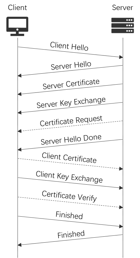 在客户端和服务端通过 HTTPS 连接的过程中,除了正常的 HTTP 连接中的事情,还有身份验证和加密信息两件事,下面看看具体过程(更详细内容可以查看标准:RFC5246)。