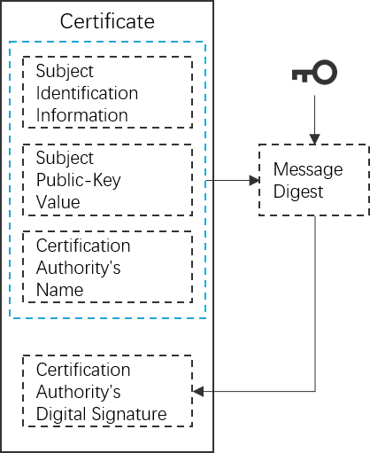 证书中包含:网站的基本信息、网站的公钥、CA 的名字等信息(详细请看 X.509),然后 CA 根据这几个内容生成摘要(digest),再对摘要用 CA 的私钥加密,加密后的结果即数字签名,最后将数字签名也放入到证书中。那么当系统收到一个证书后,先用公钥解密,解得开说明对方是由权威 CA 签发的,然后再根据证书的信息生成摘要,跟解密出来的摘要对比。