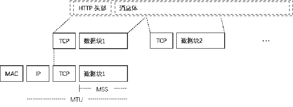 首先,在以太网中,一个包的MTU(Maximum Transmission Unit,最大传输单元)是 1500 字节,除去 TCP、IP 头部的 40字节,MSS(Maximum Segment Size,最大分段大小)就是 1460 字节,但因为加密需要,头部可能会增加,相对的 MSS 就会减少。当缓存区内的数据接近 MSS 时再发送,可以避免发送小包。但是如果数据量本来就很小,或者应用程序发送数据的频率很小,那协议栈就不得不等很长时间,所以协议栈内部还有一个定时器,一定时间之后就会将包发送出去。如果数据较小,那就几个拼个车,放在一个包里发出去,如果数据很大,就要进行拆分。大概是下面这样: