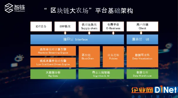 为了应对这些挑战,智链ChainNova设计了“区块链大农场”平台基础架构,区块链技术在整个“区块链大农场”平台架构中处于底层,而整个“区块链大农场”的业务还嵌入了实时计算、大数据处理、认知智能等模块。此外,由于大农场将会产生巨大的数据量以及并发数据,必须有高效的实时计算和大数据平台来承载对接IoT,而为了让用户更好的认知整个溯源历史,也在大数据的基础上做了数据可视化等。