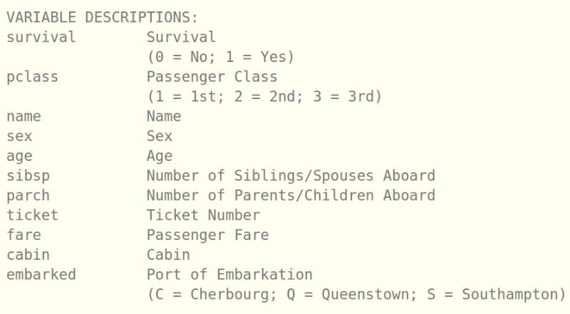 下一步是识别数据中不同的变量。通常有三种变量:数值变量、分类变量和文本变量。让我们用很受欢迎的关于泰坦尼克号的数据集来举个例子。