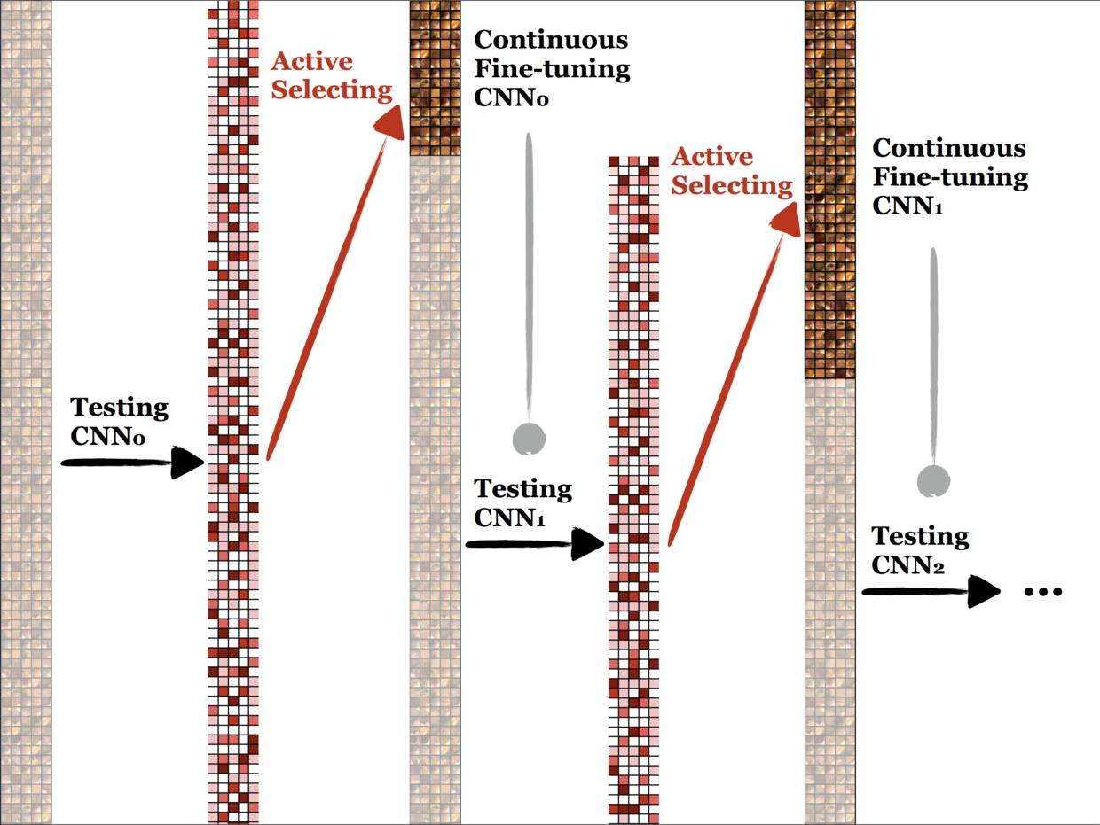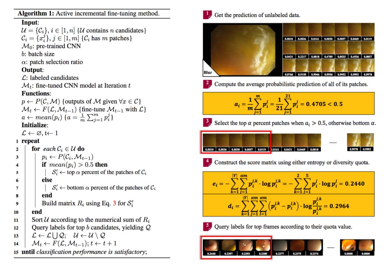 Fig.3 暗的表示unlabeled的数据,高亮的表示labeled的数据,CNN的结构可以随便挑SOTA的无所谓,CNN0是拍 retrained from ImageNet,得到的第二列表示每个image对应的importance指标,越红的说明entropy越大,或者diversity越大,每次挑这些important的sample给专家标注,这样labeled的数据就变多了,用labeled的数据训练CNN,得到新的更强的分类器了,再在unlabeled data上测试,挑出entropy/diversity大的样本,交给专家去标注,如此循环...