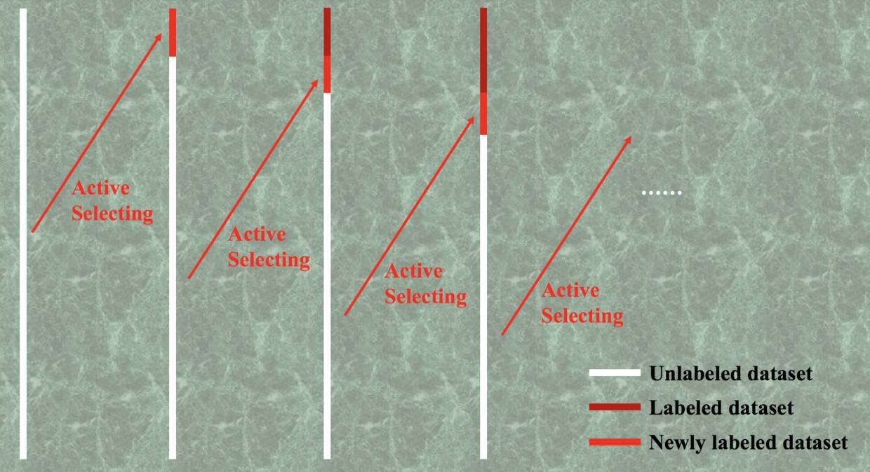 如FIG.2所示,每次循环都用不断增加的标记数据集去提升分类器的性能,每次都挑对当前分类器比较难的样本来人为标记。