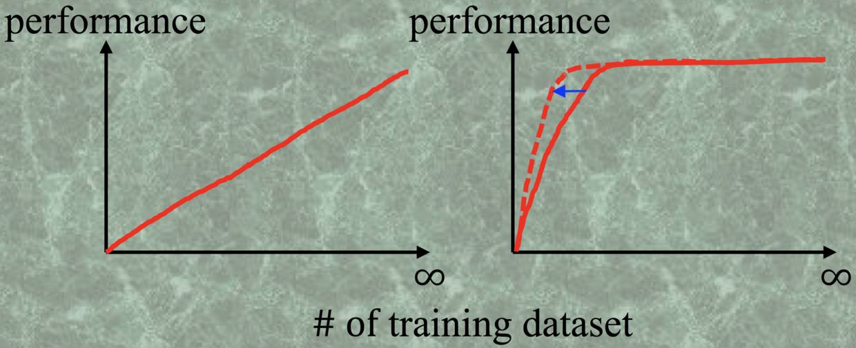 FIG.1对于很多从事深度学习的无论是研究员还是企业家都是一个十分有启发性的认知改变。一般来讲,人的惯性思维会引领一个默认的思路,就是训练样本越多越好,如左图所示,这将直接导致许多工作的停滞不前,理由永远是“我们没有足够的数据,怎么训练网络!”进一步的思路是图二的红实线认知:要多少是多啊,先训着再说,慢慢的就会发现即便用自己有的一小部分数据集好像也能达到一个不错的分类性能,这个时候就遇到一个问题:自己的数据集样本数到底有没有到达临界值呢?这个问题也很关键,它决定了要不要继续花钱去找人标注数据了。这个问题我会在第三部分去回答它,这里先假设我们知道了它的答案,接下来的问题就是如何让这个临界值变小?