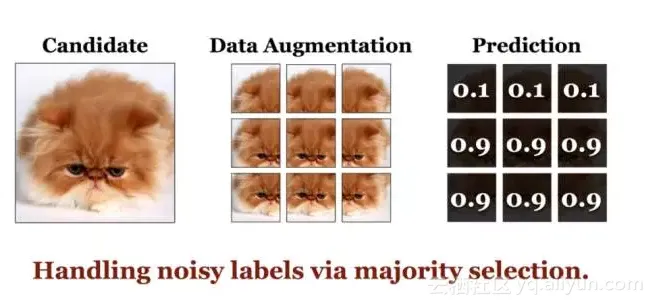 可以看出,在这个实例中,对于一个candidate,网络预测的一致性很低,套用Diversity的公式,Diversity的值很大,也就是说,应该被认为是hard sample挑出来。但是仔细观察一下这九个patches就不难看出,即便是很好的分类器,对于中间图中的1,2,3,也是很难分出这个是猫... could be rat, rabbit, etc. 我们把像这三个patch的例子叫做从data augmentation带来的noisy label issue。 而对于4~6的patches,网络很好地做出了分类,这很合情合理。所以我们把这种像1,2,3的patches,由于随机的数据扩充(Random Data Augmentation)带来的干扰样本称为noisy labels。Fig.4只是一个很直观的例子,其实在实际的数据集中会有很多这样的案例。