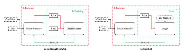 不难看出,此式子与4.1节中的变化梯度仅一字之差,只是把“打分器”给出的奖励得分 R(a^i, x^i) 换成了鉴别器认为生成对话来自真人的概率得分 D\left(a^i, x^i \right) 。看似差别很很小,实际上 RL + GAN 的文本生成技术与单纯基于RL的文本生成技术有着本质的区别:在原本的强化学习对话生成中,虽然采用了AI互相对话,并设定了 jugle 进行打分,但这个 jugle 是预训练好的,在对话模型的训练过程当中将不再发生变化;RL + GAN 的文本生成乃至对话模型则不同,鉴别器D与生成器G的训练更新将交替进行,此消彼长,故而给出奖励得分的鉴别器D在这里是动态的(dynamic)。