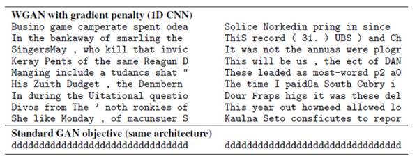 既然Wasserstein散度能够克服JS散度的上述弱点,那么使用Wasserstein GAN直接吸收生成器G softmax层output的Distribution Vector 与真实样本的 One-hot Vector,用判别器D 进行鉴定,即便判别器D不会傻到真的被“以假乱真”,但生成器output每次更加接近于真实样本的“进步”总算还是能被传回,这样就保证了对于离散数据的对抗训练能够继续下去。 不过Wasserstein GAN的原著放眼于对于GAN更加远大的改进意义,并没有着重给出关于文本生成等离散数据处理的实验,反倒是后来的一篇“Improved Training of Wasserstein GANs”[11]专门给出了文本生成的实验,从结果上可以看出,WGAN生成的文本虽然远不及当下最牛X的文本生成效果,但好歹能以character为单位生成出一些看上去稍微正常一点的结果了,对比之下,GAN关于文本生成的生成结果显然是崩塌的。