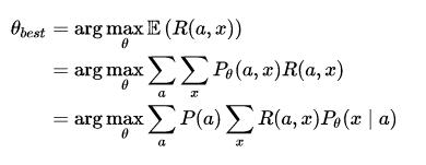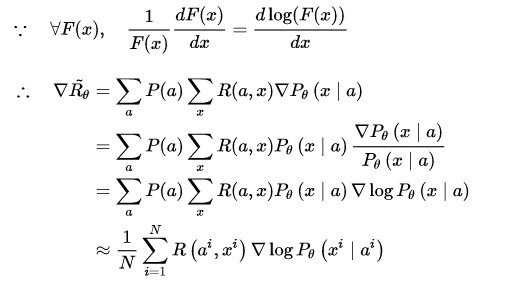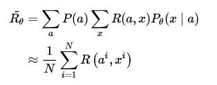 既然是一个最优化的问题,很直接地便想到使用基于梯度(Gradient)的优化方法解决。当然,在强化学习中,我们要得到的是最优策略 \theta_{best} ,此过程便在强化学习领域常听到的 Policy Gradient。我们把等式右边 \arg \max \limits_{\theta}(\cdot) 中的项单独记为 \tilde{R_{\theta}} ,它表示对话模型找到最优参数时所得到的奖励期望。在实做时,设某句话的应答有$N$种可能性,则每组对话 (a^i, x^i) 出现的概率可视为服从均匀分布,故还可以进行如下变形:
