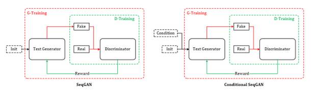 另外一种方法提出于Conditional SeqGAN的论文,干脆训练一个可以对部分已生成前缀进行打分的new鉴别器D。将某真实样本的 X^+ 的全部前缀子序列(必须从第一个词开始)集合记作 \left\{x^+[1:t] \right\}_{t=1}^{T_{X^+}} ,同样将某生成样本$X^-$的全部前缀子序列集合记作 \left\{x^-[1:t] \right\}_{t=1}^{T_{X^-}} ,我们每次从这两者中随机挑选一个或若干个标定为 + 或 - (与原序列相同),与原序列一同加入鉴别器D的训练中,这样训练得到的Discriminator便增添了给前缀子序列打分的能力,直接使用这样的Discriminator给前缀子序列打分即可获得 D_e\left(a^i, x^i[1:t] \right) 。这种方法的耗时比起使用MC search要少很多,但得损失一定的准度。