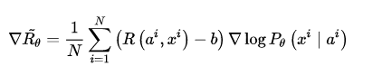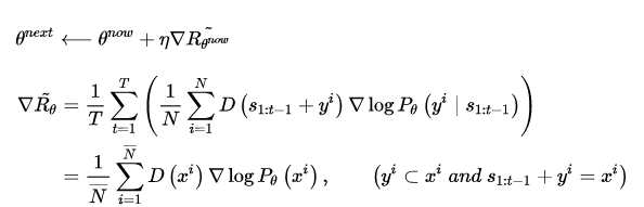\nabla\tilde{R_{\theta}} = \frac{1}{N} \sum\limits_{i=1}^{N} \sum\limits_{t=1}^{T} \left(D_e\left(a^i, x^i[1:t] \right) - b\right) \nabla\log P_{\theta}\left(x^i[t] \mid a^i, x^i[1:t-1] \right)