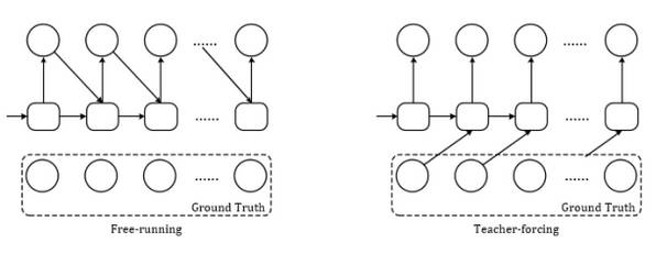 在开始讲解SeqGAN中的Teacher Forcing之前,先帮助大家简单了结一下RNN运行的两种mode:(1). Free-running mode;(2). Teacher-Forcing mode[22]。前者就是正常的RNN运行方式:上一个state的输出就做为下一个state的输入,这样做时有风险的,因为在RNN训练的早期,靠前的state中如果出现了极差的结果,那么后面的全部state都会受牵连,以至于最终结果非常不好也很难溯源到发生错误的源头,而后者Teacher-Forcing mode的做法就是,每次不使用上一个state的输出作为下一个state的输入,而是直接使用ground truth的对应上一项作为下一个state的输入。