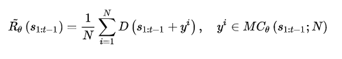 这里要说明几点,假设需要生成的序列总长度为 T , s_{1:t-1} 是指先前已经生成的部分序列(在RL中可视为当前的状态),通过蒙特卡洛搜索得到 N 种后续的序列,尽管文本生成依旧是逐词寻找期望奖励最大的Action(下一个词),判别器D还是以整句为单位对生成的序列给出得分 Reward 。