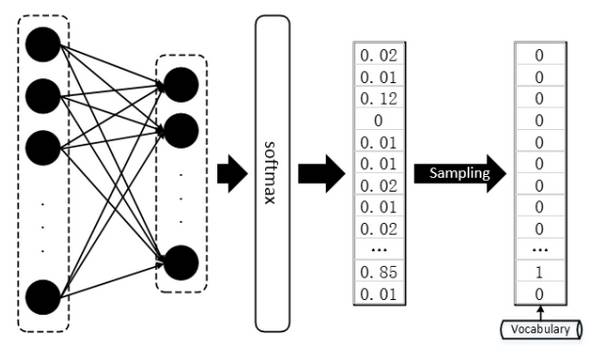文本数据可就不一样了,做文本的同学都知道,假设我们的词库(Vocabulary)大小为1000,那么每当我们预测下一个出现的词时,理应得到的是一个One-hot的Vector,这个Vector中有999项是0,只有一项是1,而这一项就代表词库中的某个词。然而,真正的隔阂在于,我们每次用无论什么分类器或者神经网络得到的直接结果,都是一个1000维的概率分布,而非正正好好是一个One-hot的Vector,即便是使用softmax作为输出,顶多也只能得到某一维上特别大,其余维上特别小的情况,而将这种输出结果过渡到One-hot vector 然后再从词库中查询出对应index的词,这样的操作被称为“Sampling”,通常,我们找出值最大的那一项设其为1,其余为0。