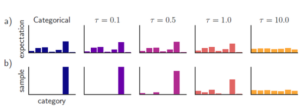 精髓在于这其中的“逆温参数” \tau ,当 \tau \longrightarrow 0 时,上式所输出的分布等同于 one\_hot(\cdot) + \arg\max(\cdot) 给出的 Sampling 分布,而当 \tau \longrightarrow \infty 时,上式的输出就接近于均匀分布,而 \tau 则作为这个特殊softmax中的一个超参数,给予一个较大的初始值,通过训练学习逐渐变小,向 0 逼近,这一部分详细内容可以阅读文献[15]。