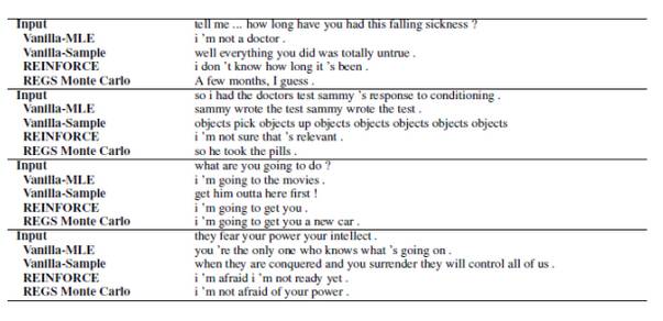RL+ GAN 利用强化学习中的 Reward 机制以及 Policy Gradient 等技术,巧妙地避开了GAN面对离散数据时梯度无法BP的难题,在使用强化学习的方法训练生成器G的间隙,又采用对抗学习的原版方法训练判别器D。 在Conditional SeqGAN对话模型的一些精选结果中,RL+ GAN 训练得到的生成器时常能返回一些类似真人的逼真回答(我真有那么一丝丝接近“恐怖谷”的感受)。