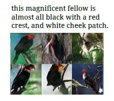 SeqGAN的提出为GAN用于对话生成(Chatbot)完成了重要的铺垫,同样起到铺垫作用的还有另外一个GAN在图像生成领域的神奇应用——Conditional GAN[18~19],有条件的GAN,顾名思义就是根据一定的条件生成一定的东西,该工作根据输入的文字描述作为条件,生成对应的图像,比如:
