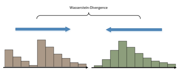 Wasserstein GAN 对GAN的改进也是从替换 KL-Divergence 这个角度对GAN进行改进,其详细的妙处大可参看文献[10,13],总的来说,WGAN采用了一种奇特的 Divergence—— “推土机-Divergence”, Wasserstein-Divergence 将两个分布看作两堆土,Divergence 计算的就是为了将两个土堆推成一样的形状所需要泥土搬运总距离。如下图: