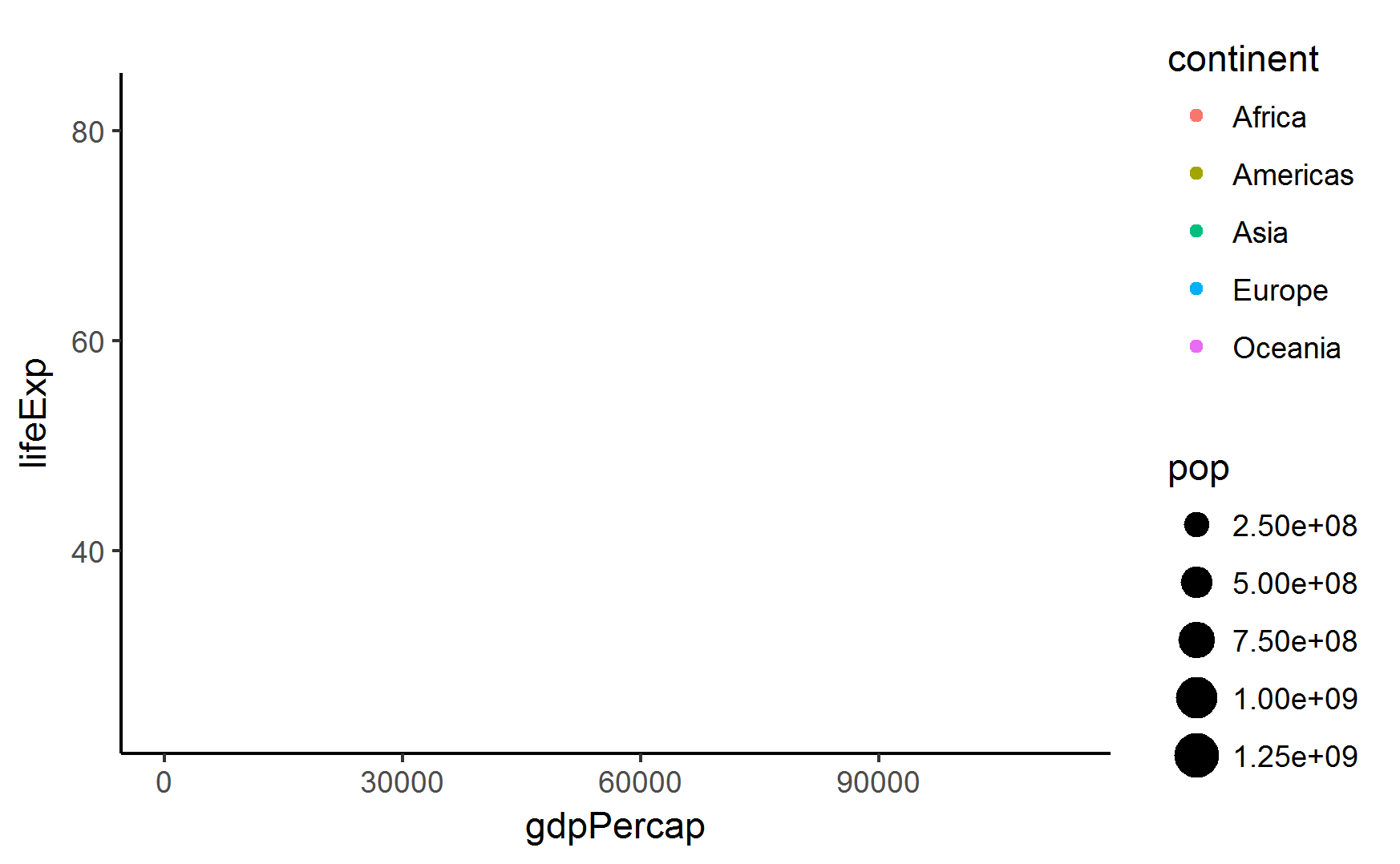 创造一个和GDP、预期寿命以及时间相关的3D制图,为每个洲或国家画出线条。问题是:人类阐释以2D形式画出3D图像的能力是非常的薄弱的,尤其是当存在太多数据时。因此,这个选择不奏效。