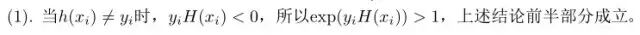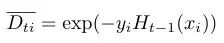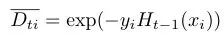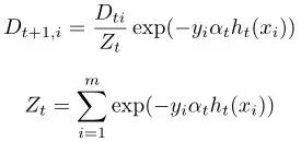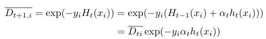 这便得到了基础模型的组合系数,再回头看每轮提升过程中样本权值的更新过程:
