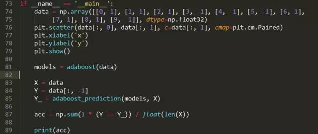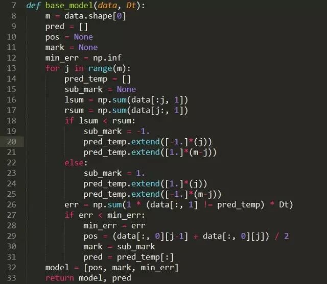 定义基础模型:其中,data就是输入的训练数据,Dt则是第t个基础模型对应的训练样本的权重。这里定义的基础模型非常简单,即找到一个阈值,以该阈值为分类边界进行分类。