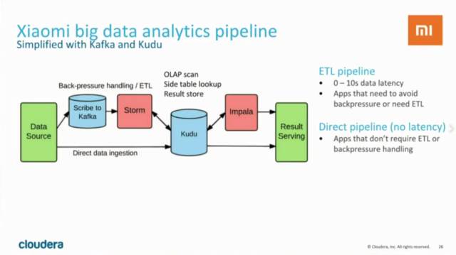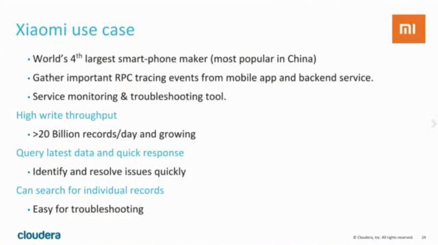Kudu的应用场景很广泛,比如可以进行实时的数据分析,用于数据可能会存在变化的时序数据应用等,甚至还有人探讨过使用Kudu替代Kafka的可行性(详情请戳 http://blog.rodeo.io/2016/01/24/kudu-as-a-more-flexible-kafka.html)。不过Kudu最有名和最成功的应用案例,还是国内的小米。小米公司不仅使用Kudu,还深度参与了Kudu的开发。Kudu项目在2012年10月由Cloudera公司发起,2015年10月对外公布,2015年12月进入Apache孵化器,但是小米公司早在2014年9月就加入到Kudu的开发中了。 下面我们可以跟随Cloudera在宣传Kudu时使用的ppt来看一看Kudu在小米的使用。