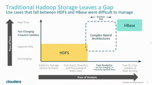 言归正传,现在提起大数据存储,我们能想到的技术有很多,比如HDFS,以及在HDFS上的列式存储技术Apache Parquet,Apache ORC,还有以KV形式存储半结构化数据的Apache HBase和Apache Cassandra等等。既然有了如此多的存储技术,Cloudera公司为什么要开发出一款全新的存储引擎Kudu呢?