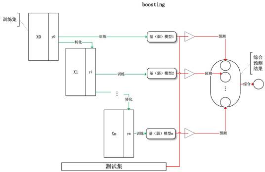 Boosting(Adaptive Boosting的简称),基于错误提升分类器性能,通过集中关注被已有分类器分类错误的样本,构建新分类器并集成。其思想为模型每次迭代时通过调整错误样本的损失权重,提升对数据样本整体的处理精度。