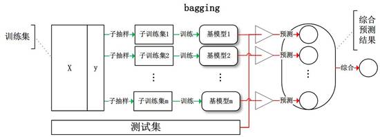Bagging:基于数据随机重抽样的分类器构建方法。从训练集从进行子抽样组成每个基模型所需要的子训练集,对所有基模型预测的结果进行综合产生最终的预测结果。
