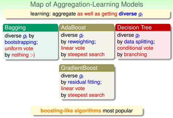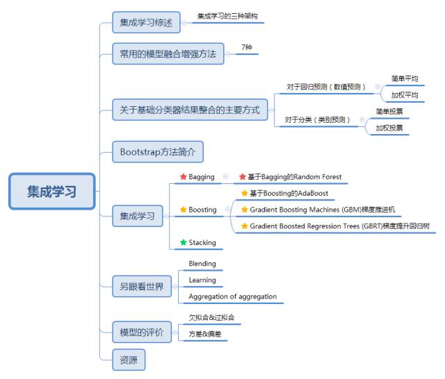 最后我们也可以按照林轩田老师课程中的讲述来对机器学习集成算法做一个归纳。集成模型主要分为两条主线,一条Blending 线,一条 Learning线。Blending 假设我们已经得到了各个基础分类器 ,learning 主要指我们面对的是一堆数据,需要一边获得基础分类器 ,同时一边学习融合它们的方法。
