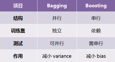 Bagging 减小方差(variance ),而Boosting减小偏差(bias),关于具体的细节,可以参考知乎网友的解答为什么说bagging是减少variance,而boosting是减少bias?(https://www.zhihu.com/question/26760839)