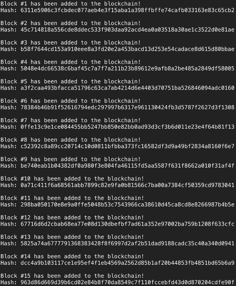 看到了吧,这就是区块链。如果希望在控制台中查看更多信息,可以编辑完整的源文件并打印每个块的时间戳或数据。