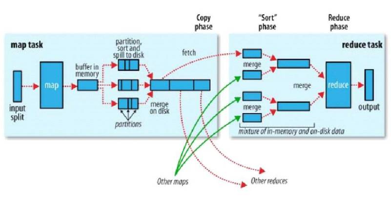 第三个阶段是shuffle,主要做排序、分区、分组,连接map与reduce。