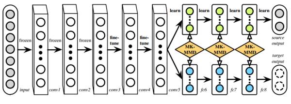 适配高层网络的代表性工作是Eric Tzeng等人在2014年发在arXiv上的《Deep domain confusion: maximizing for domain invariance》(至今没找到到底发在哪了)。这篇文章针对于预训练的AlexNet(8层)网络,在第7层(也就是feature层,softmax的上一层)加入了MMD距离来减小source和target之间的差异。这个方法简称为DDC。这篇文章概括一点说,就是适配了最高层网络,只有一层。那么,是否只适配这一层就够了呢?