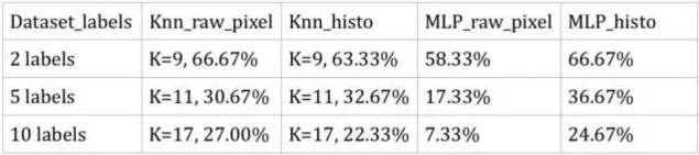 在神经网络MLP分类器中,原始像素精度远低于直方图精度。而对于整个数据集(含有10个标签)来说,原始像素精度甚至低于随机猜测。