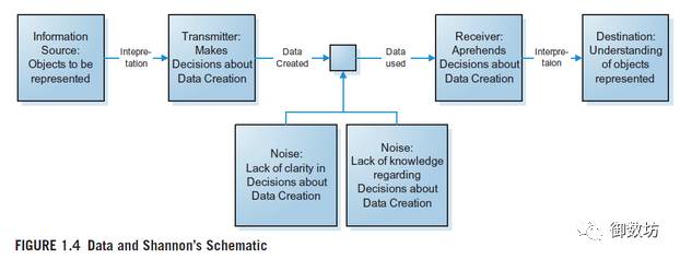 因此,以提升数据质量为目标,我们要充分理解客观世界(即企业的业务活动)、明确“企业的希望”、达成共识、设计合理的信息系统和数据架构、管理好数据定义(元数据)、确保数据生成方、数据使用方对数据的理解一致、并对上述过程中的关键点进行适当检查、监控,确保数据忠实记录了客观世界、反映了企业的数据使用希望...这段话,做数据治理的朋友们应该都能更好的理解了。这也是为什么笔者非常推荐这个版本对数据的定义——从数据的本质是什么,到数据如何生成、如何理解,再到数据质量问题产生的根源。在原书中还有另一张有启发意义的图,结合了香农信息论的原理说明了数据质量问题产生的原因,就不再展开介绍了。