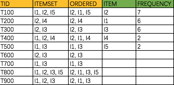 首先对实务中的所有项集计算支持度,然后按照倒序排序,如下图中的绿表所示。然后对每条事务中的项也按照这个倒序,重新排列。例如,对T100这个事务,原来是无序的Ⅰ1, Ⅰ2, Ⅰ5, 但因为Ⅰ2的支持度按照倒序排列在Ⅰ1之前,因此重新排序之后的顺序为Ⅰ2,Ⅰ1,Ⅰ5。经过重新排序后的事务的项集如下表中的第三列所示。