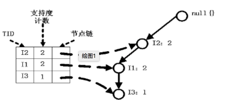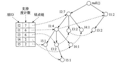 根据每条事务中事务项的新顺序,依此插入到一棵以Null为根节点的树中。同时记录下每个事务项的支持度。这个过程完成之后,我们就得到了棵FP-tree树结构。