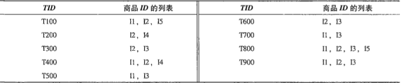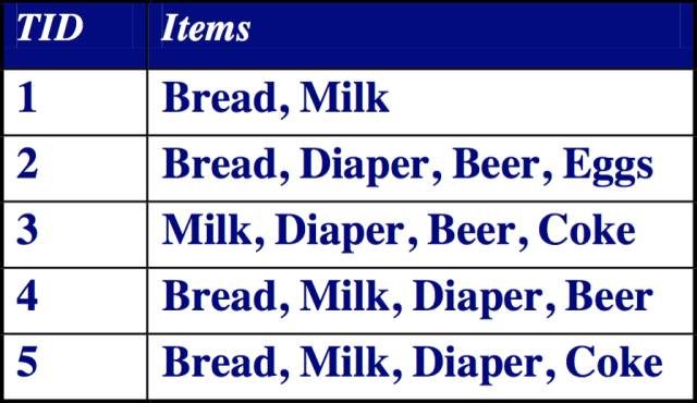 如同上表所示的二维数据集就是一个购物篮事务库。该事物库记录的是顾客购买商品的行为。这里的TID表示一次购买行为的编号,items表示顾客购买了哪些商品。