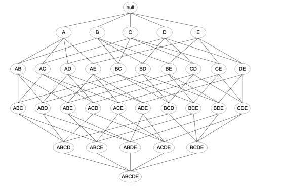 光是一个6个项的数据集产生的规则就有602条,随着项数量的增加,原始算法的复杂度将成级数增长。下面这个格结构常常用来枚举所有规则的可能性。