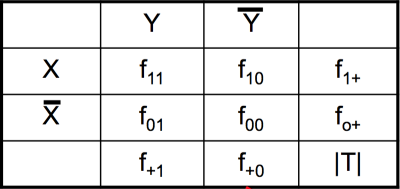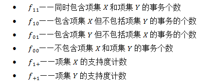 下表是一个二元相依表,表中列出了两个项集所产生的四种情况的二元相依表。其中X表示项集X在事务中出现,