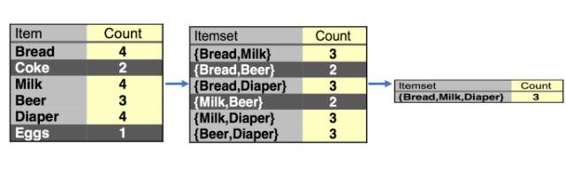 如果一个项集是非频繁项集,那么这个项集的超集就不需要再考虑了。因为如果这个项集是非频繁的,那么它的所有超集也一定都是非频繁的。在项集的超集是指,包含这个项集的元素且元素个数更多的项集。在购物篮事务库中{Milk,Beer}就是{Milk}的其中一个超集。这个原理很好理解,如果{Milk}出现了3次,{Milk,Beer}一起出现的次数一定小于3次。所以如果一个项集的支持度小于最小支持度这个阈值了,那么它的超集的支持度一定也小于这个阈值,就不用再考虑了。