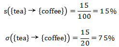 通过表中所给的信息可以用支持度和置信度评估关联规则{tea}→{coffee}。
