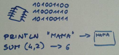 我主要讲解了处理器,告诉孩子们它用的是一种有趣的语言,只包含0和1。我假装用一种只有A和B的语言说话,孩子们和我玩得很开心。然后我解释了程序员们创造出程序语言就是为了能更方便地和处理器对话。