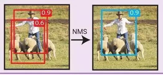 一个融合重叠边界框(提交或侦测出的)的一般性算法。所有明显和高信度边界框重叠的边界框(IoU > IoU_threshold)都会被抑制(去除)。
