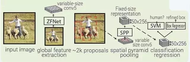 SPPNet 用选择性搜索在每张图像中生成 2000 个区域(region proposal)。然后使用 ZFNet-Conv5 从整幅图像中抓取一个共同的全体特征量。对于每个被生成的区域,SPPNet 都使用 spatial pyramid pooling(SPP)将该区域特征从全体特征量中 pool 出来,生成一个该区域的长度固定的表征。这个表征将被用于训练目标分类器和 box regressor。从全体特征量 pooling 特征,而不是像 RNN 那样将所有图像剪切(crops)全部输入一个完整的 CNN,SPPNet 让速度实现了 2 个数量级的提升。需要指出,尽管 SPP 运算是可微分的,但作者并没有那么做,因此 ZFNet 仅在 ImageNet 上训练,没有做 finetuning。
