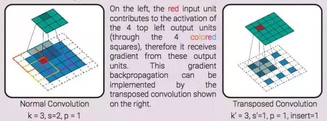 这一操作对卷积中的梯度进行反向传播。换句话说,它是卷积层的反向传递。反向的卷积可以作为一个正常的卷积部署,并且在输入特征中不需要任何插入。