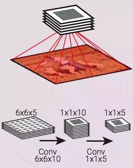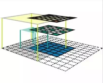 这是一组特征地图,每一张地图会在输入地图中的一些固定位置搜寻特定的特征。所有的特征的接受域大小都是一样的。
