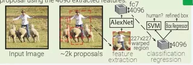 RCNN:基于区域的ConvNet(RCNN)是启发式区域提案法(heuristic region proposal method)和ConvNet特征提取器的自然结合。从输入图像,使用选择性搜索生成约2000个边界框提案。这些被推出区域被裁剪并扭曲到固定大小的227x227图像。 然后,AlexNet为每个弯曲图像提取4096个特征(fc7)。然后训练一个SVM模型,使用4096个特征对该变形图像中的对象进行分类。并使用4096个提取的特征来训练多个类别特定的边界框回归器来改进边界框。